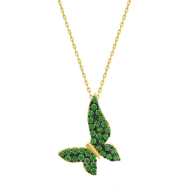 Lanț din aur galben de 14K cu pandantiv fluture și pietre Cubic Zirconia verzi.