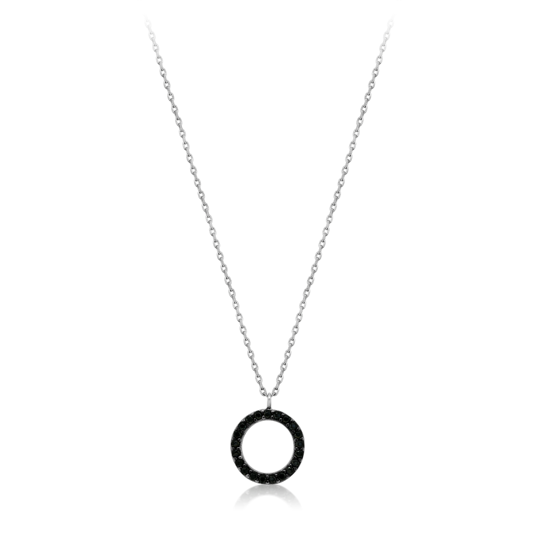 Lanț din aur alb de 14K și pandantiv rotund cu pietre Cubic Zirconia negre.