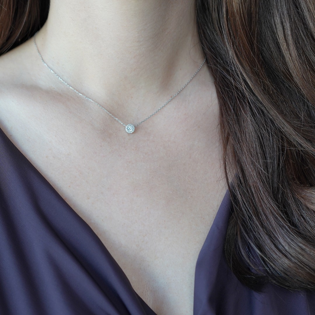 Lanț din aur alb de 14K și pandantiv cu zirconii incolore.