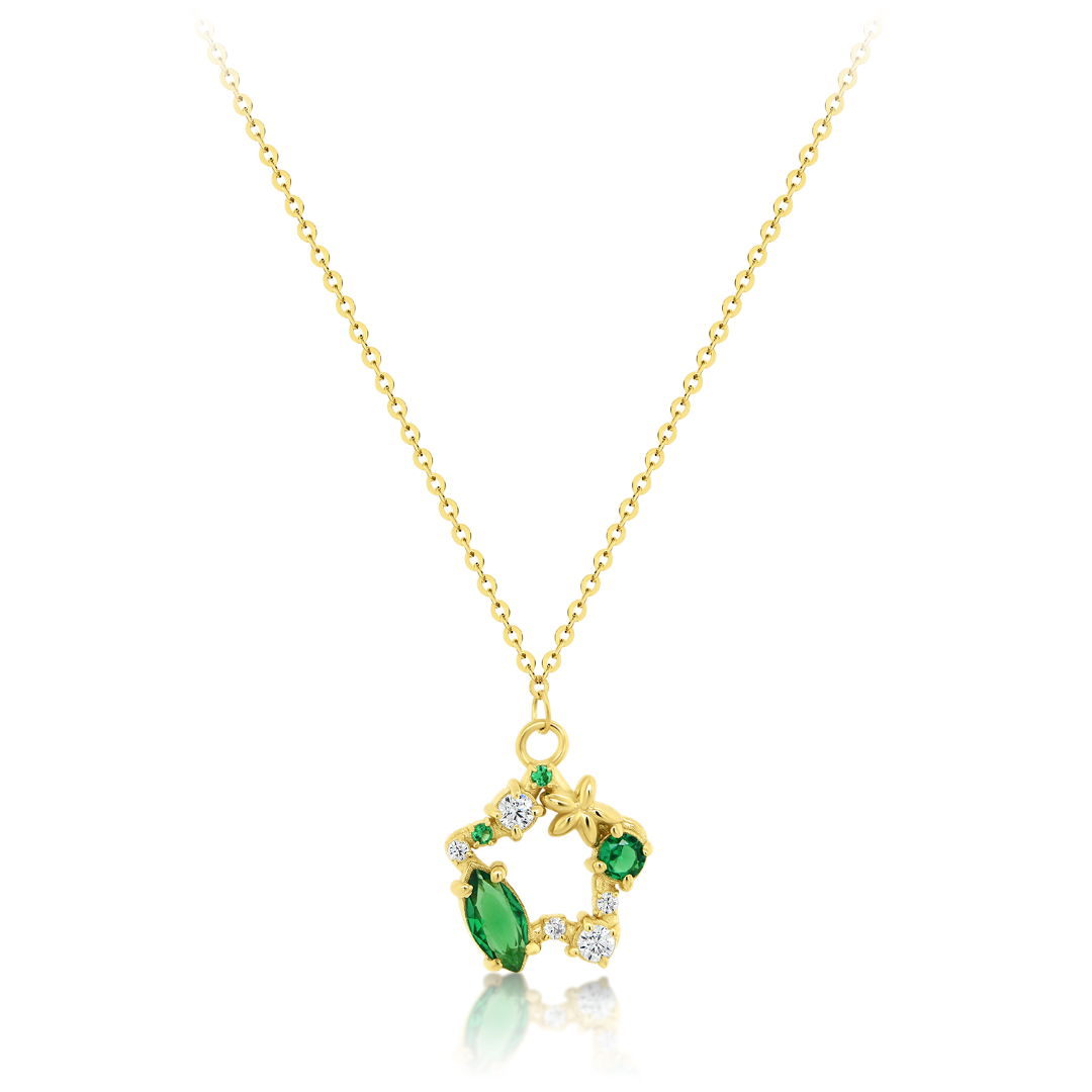 Lanţ cu pandantiv din aur galben de 14K cu pietre Cubic Zirconia albe și verzi.