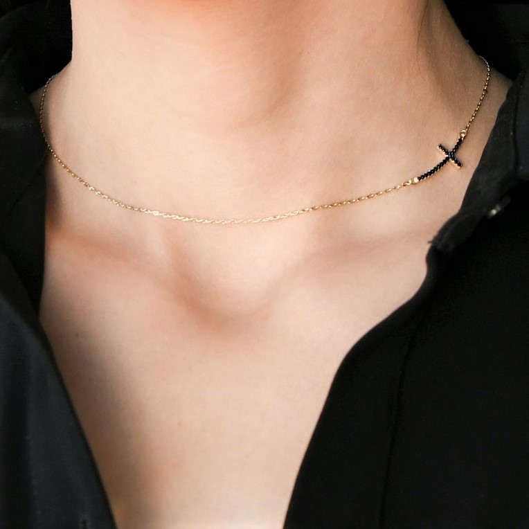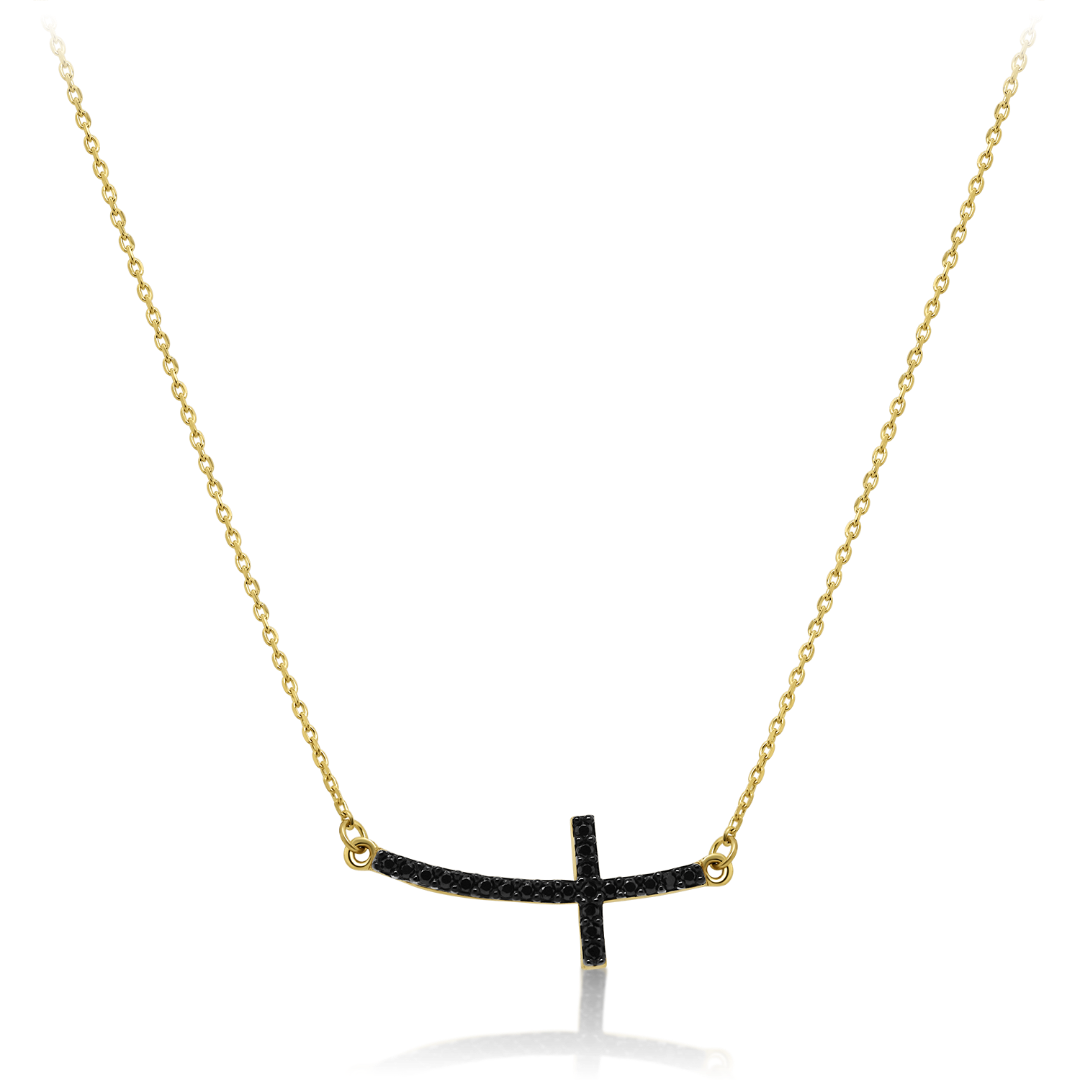 Lanț din aur galben de 14K ,cu pandantiv cruce și pietre Cubic Zirconia negre.