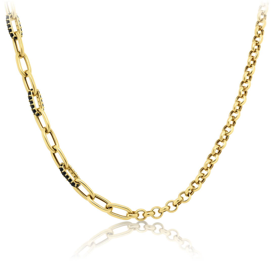 Lanț cu două tipuri de zale din aur galben de 14K și pietre cubic zirconia negre.