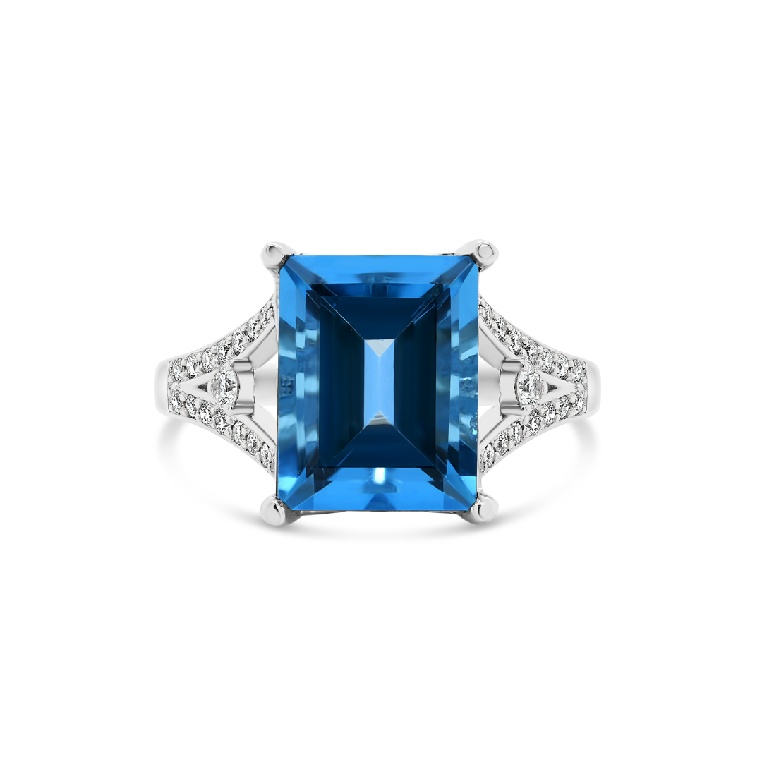 Inel din aur alb de 14K cu un Blue Topaz de 4.57ct și Diamante naturale brilliant cut.