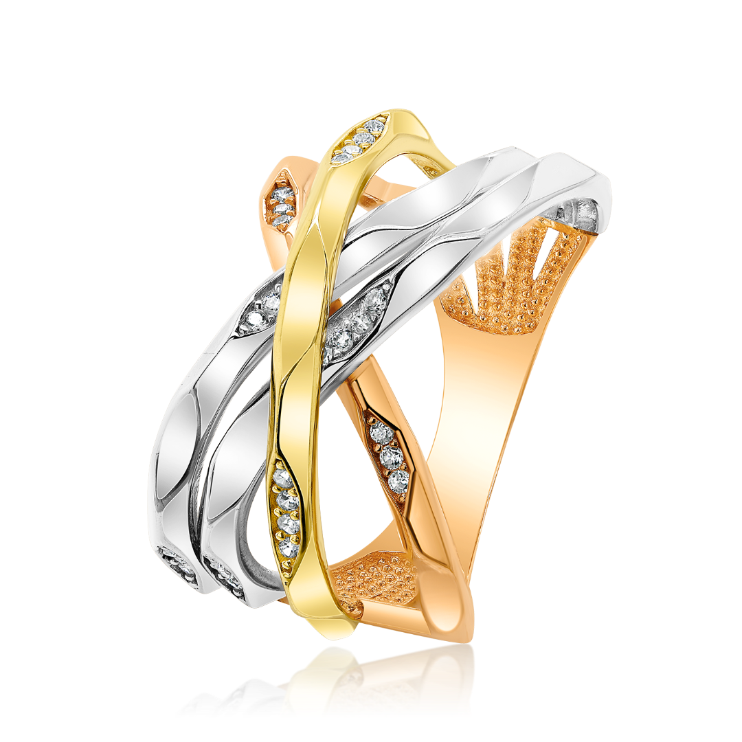 Inel din aur galben, alb și roz de 14K, cu elemente fațetate și pietre Cubic Zirconia albe.