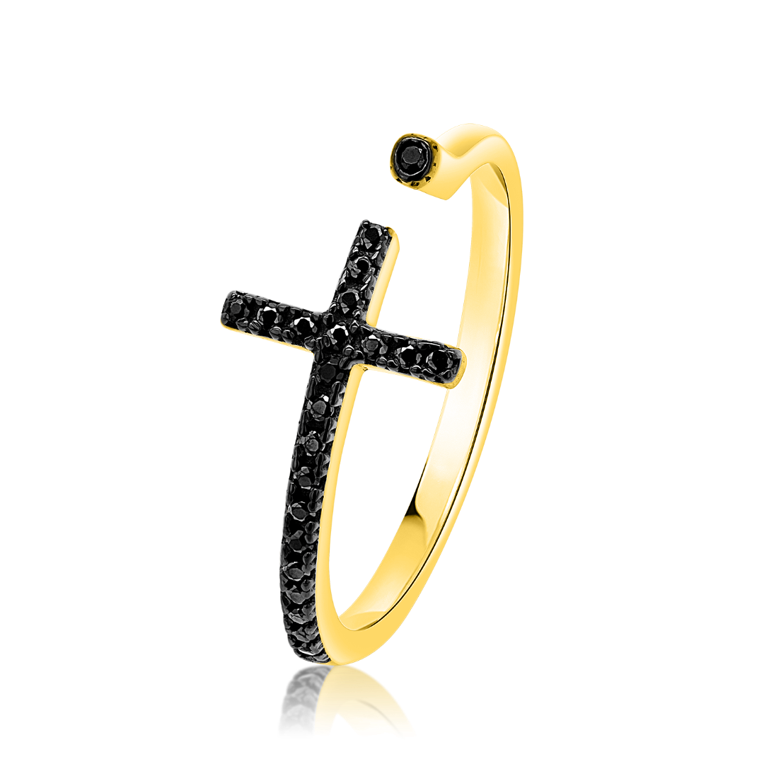Inel din aur galben de 14K, cu element cruce și pietre Cubic Zirconia negre.