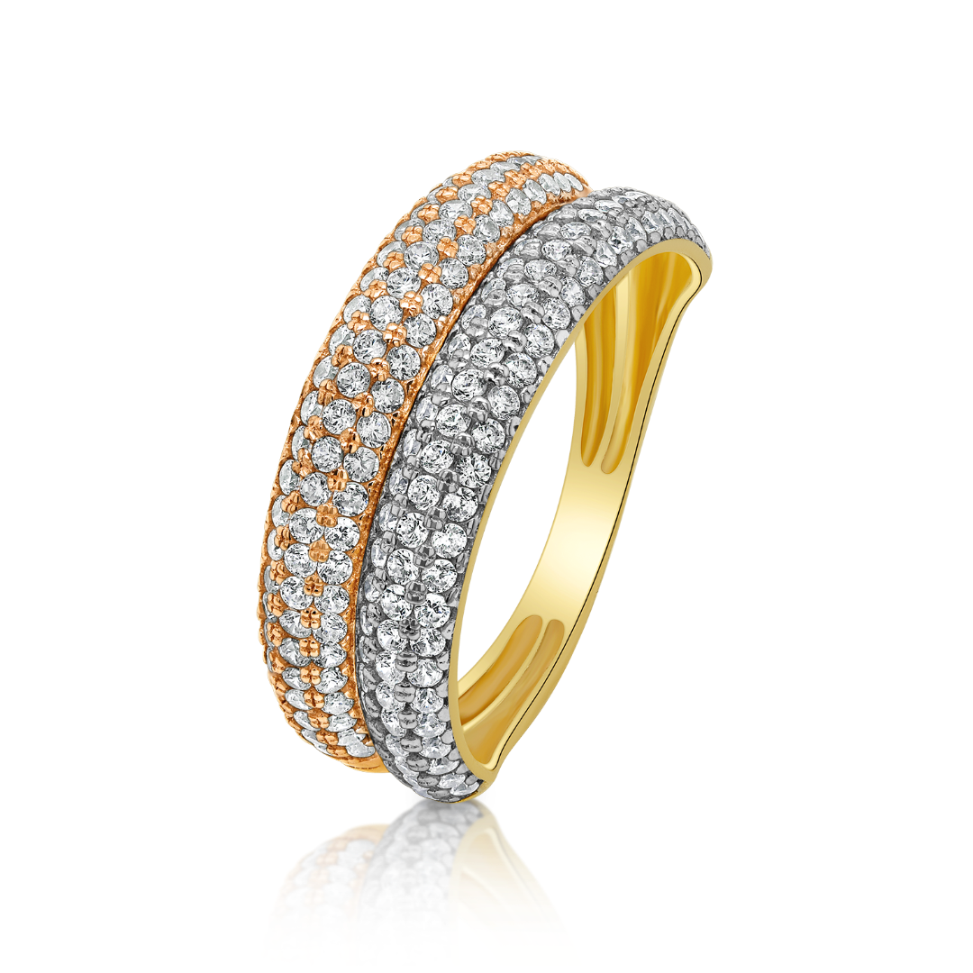 Inel din aur de 14K galben, cu elemente din aur roz si alb și pietre Cubic Zirconia albe.