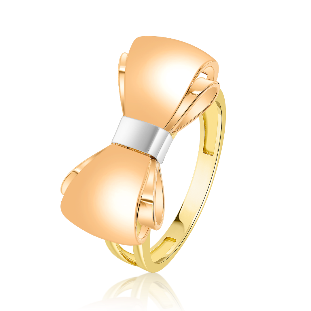 Inel din aur galben, alb și roz de 14K cu element tip fundiță.