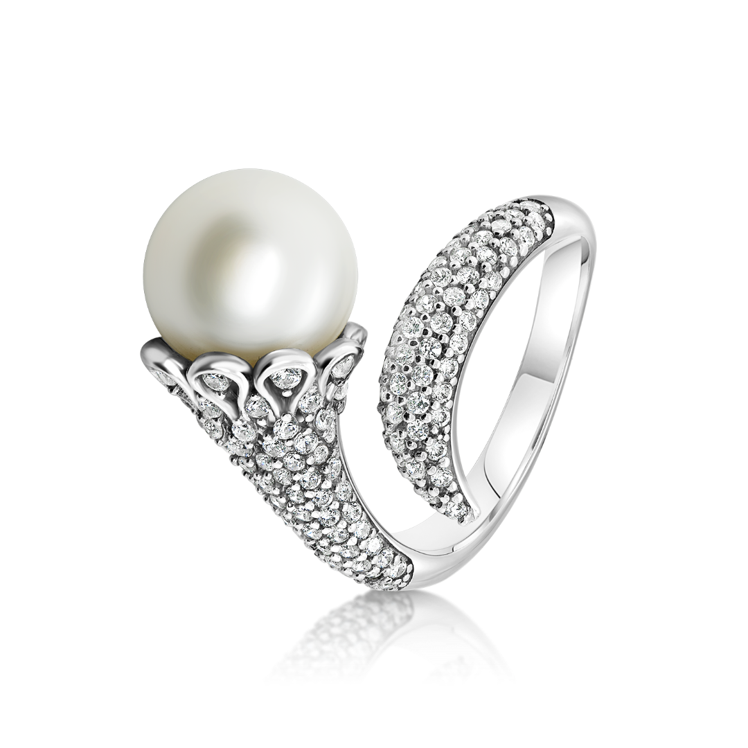 Inel din aur alb de 14K, cu Perlă și Pietre Cubic Zirconia.