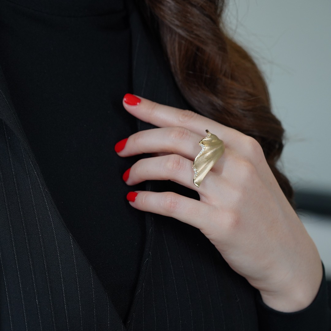 Inel cu efect satinat din aur galben de 14K cu pietre cubic zirconia.