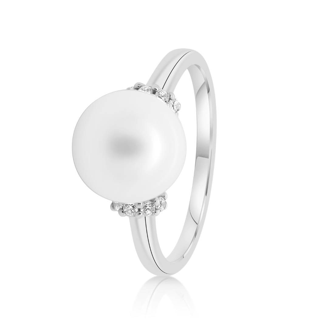 Inel din aur alb de 14K, cu Perlă și pietre Cubic Zirconia albe.