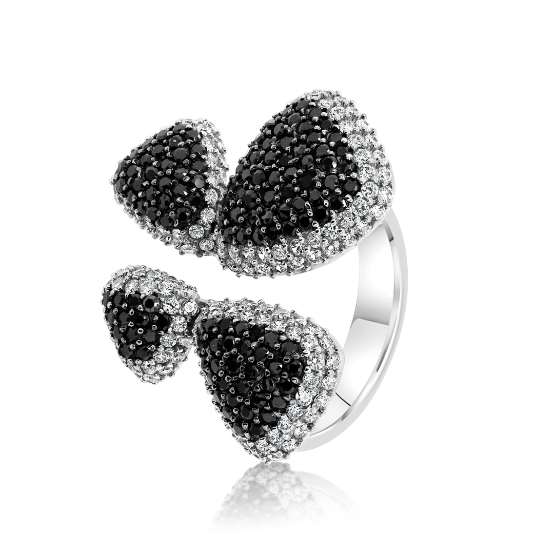 Inel din aur alb de 14K cu element tip fluture încrustat și cu pietre Cubic Zirconia albe si negre.