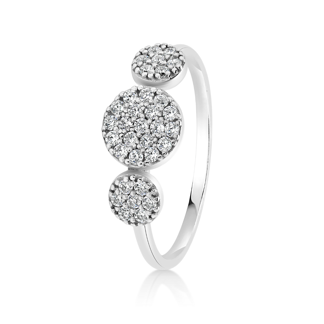Inel din aur alb de 14K, cu elemente rotunde și pietre cubic zirconia.