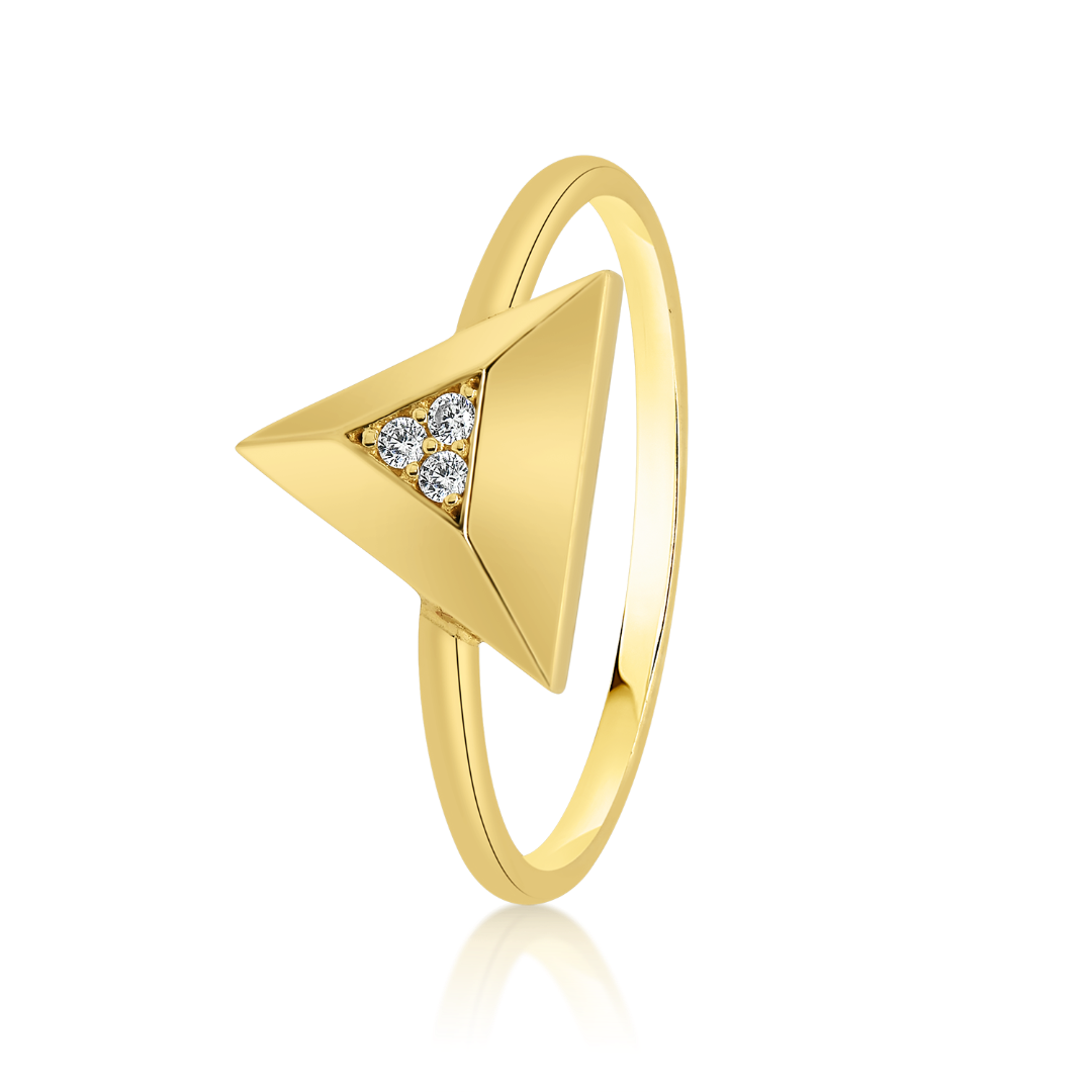 Inel din aur galben de 14K, cu element triunghi și pietre cubic zirconia.