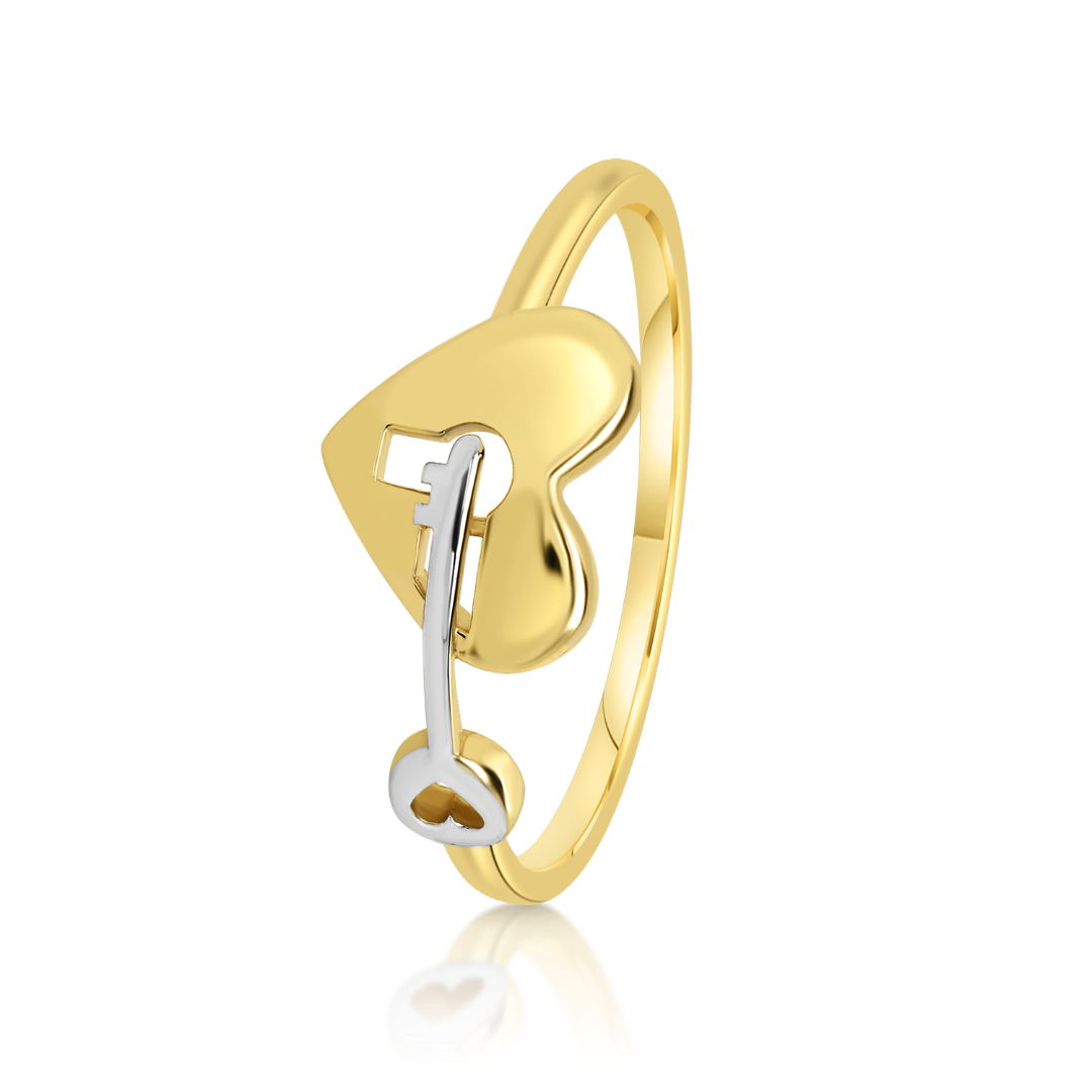 Inel din aur galben de 14K, cu elemente în formă de inimă și cheie.