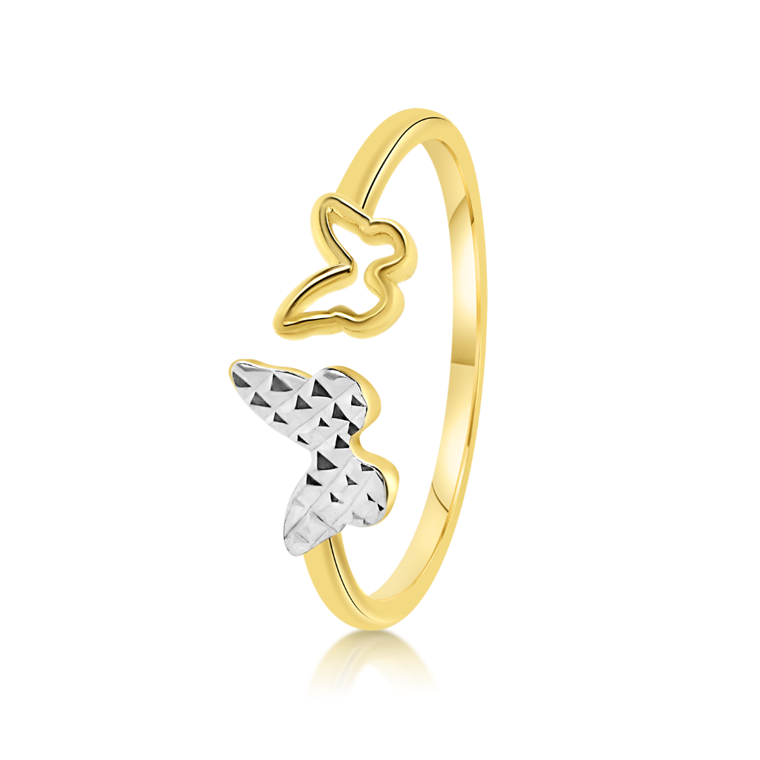 Inel reglabil din aur galben de 14K, cu element fațetat în formă de fluture din aur alb.