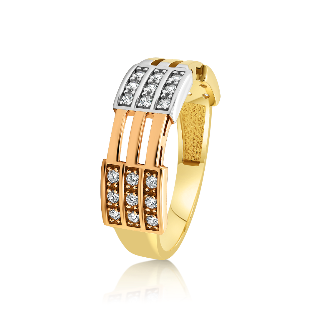 Inel din aur galben de 14K, cu elemente din aur alb și roz și pietre Cubic Zirconia.