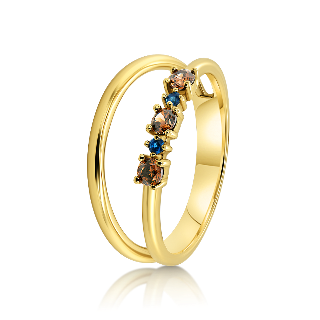 Inel din aur galben de 14K, cu pietre Cubic Zirconia maro și albastre.