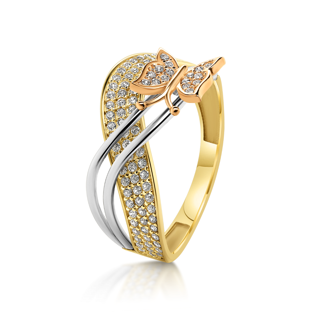 Inel din aur galben de 14K, cu pietre Cubic Zirconia și element din aur roz.