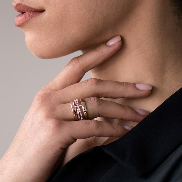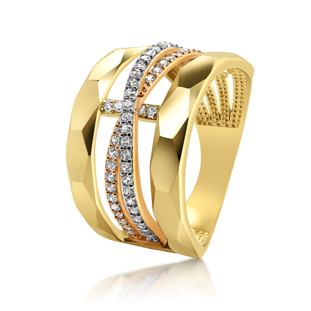 Inel din aur galben de 14K cu elemente fațetate, rodiu roz și pietre Cubic Zirconia albe.