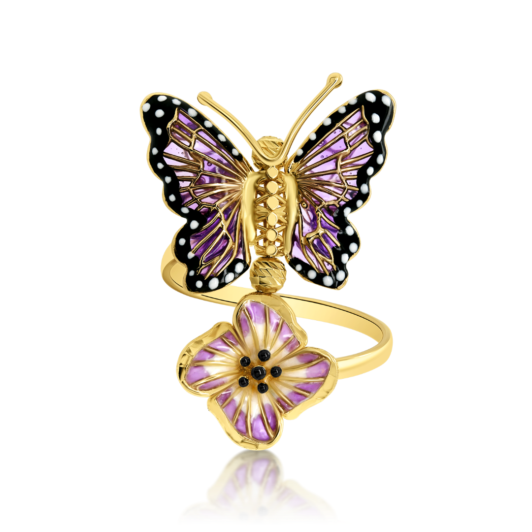 Inel aur galben de 14K, cu elemente tip floare și fluture cu Email colorat.