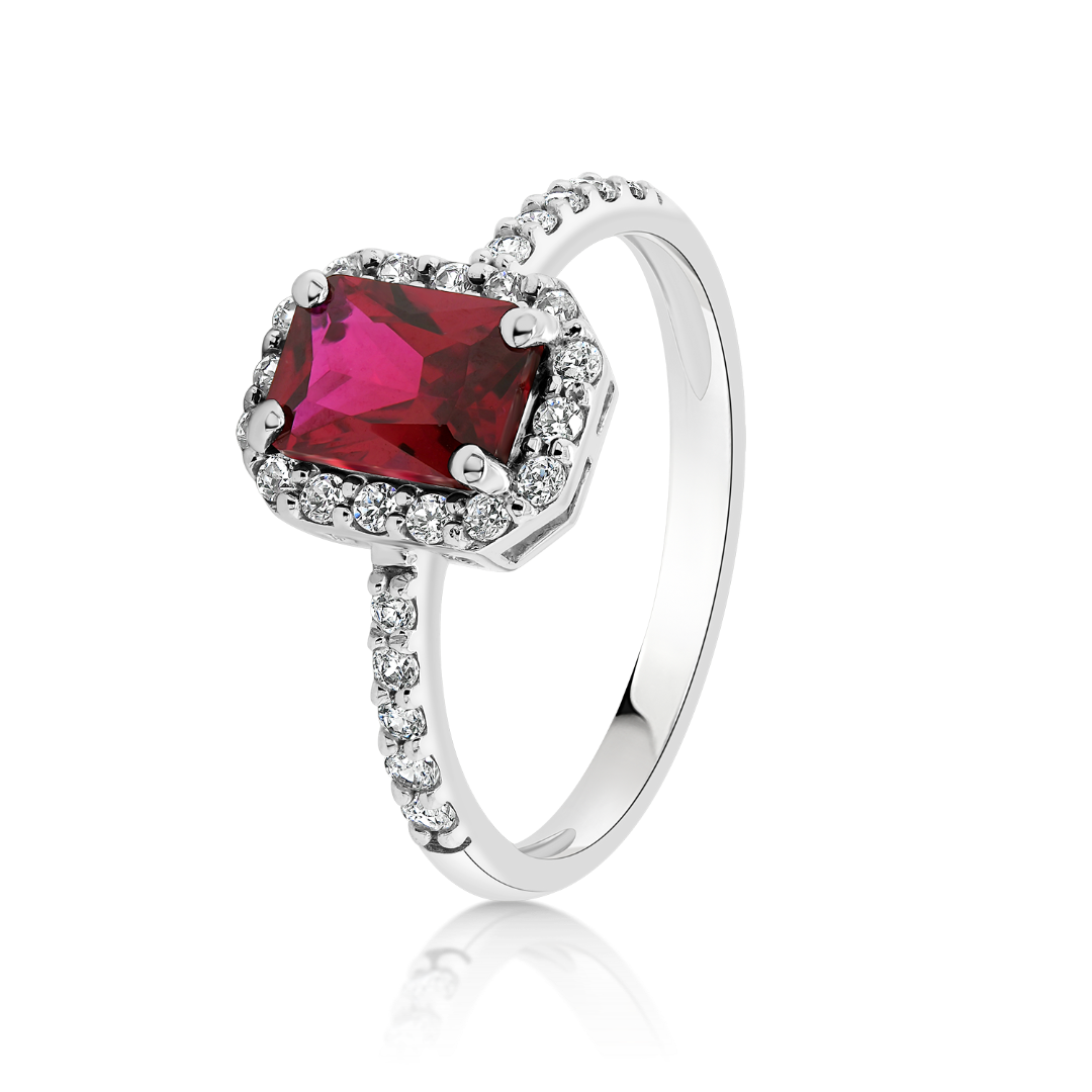 Inel din aur alb de 14K, cu pietre Cubic Zirconia albe și piatră centrală Cubic Zirconia roșie.