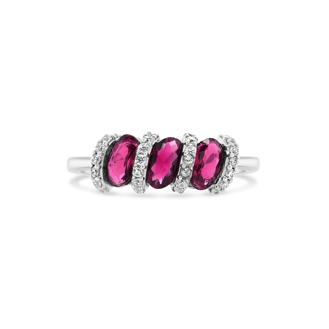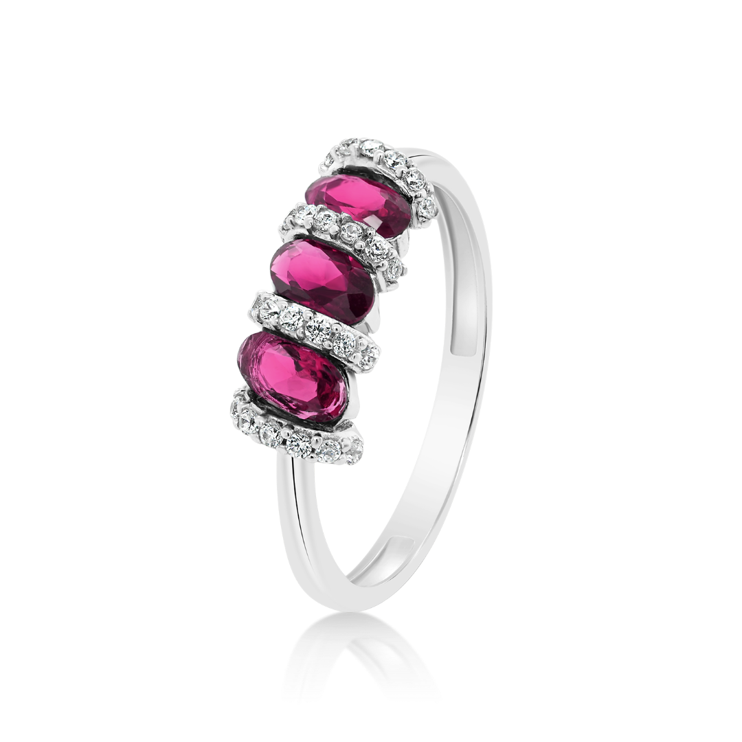 Inel din aur alb de 14K, cu pietre cubic zirconia roșii și incolore.