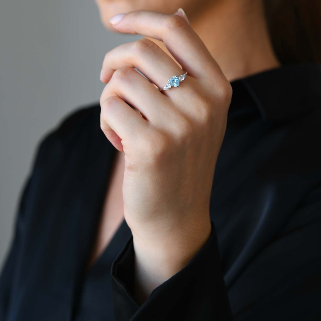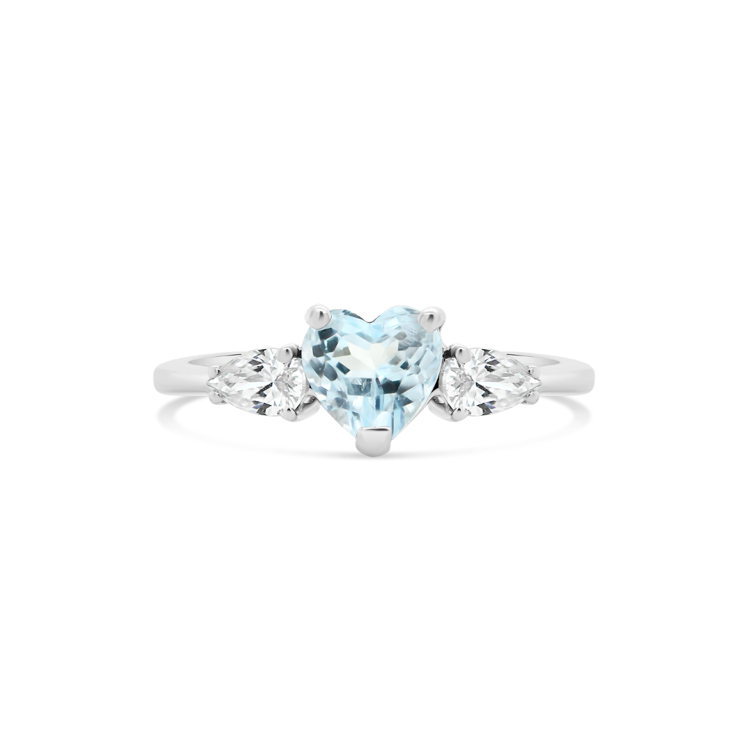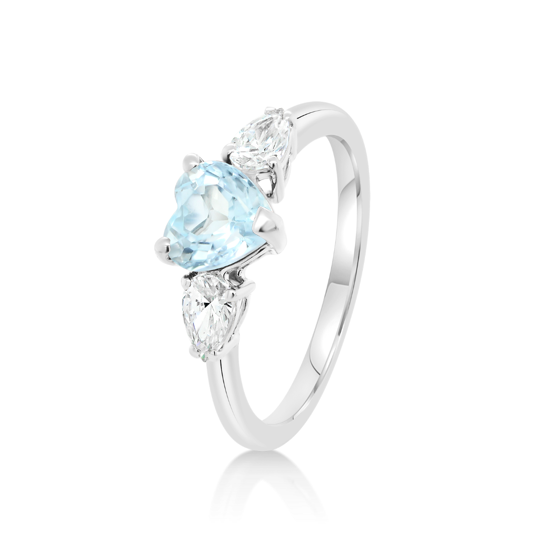 Inel din aur alb de 14K cu zirconia albastră în formă de inimă.