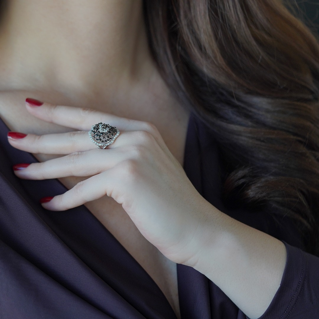 Inel din aur alb de 14K cu pietre cubic zirconia negre și incolore.