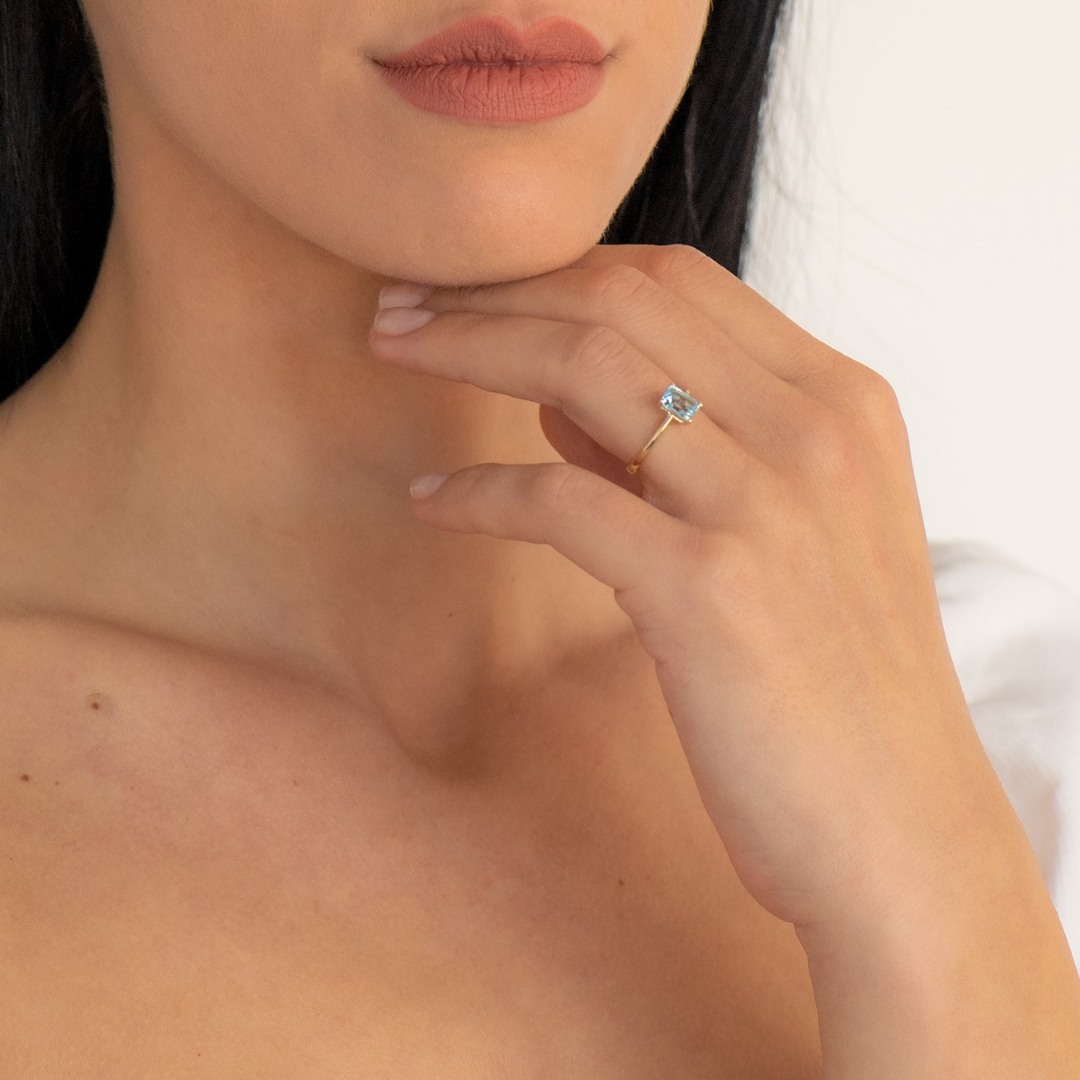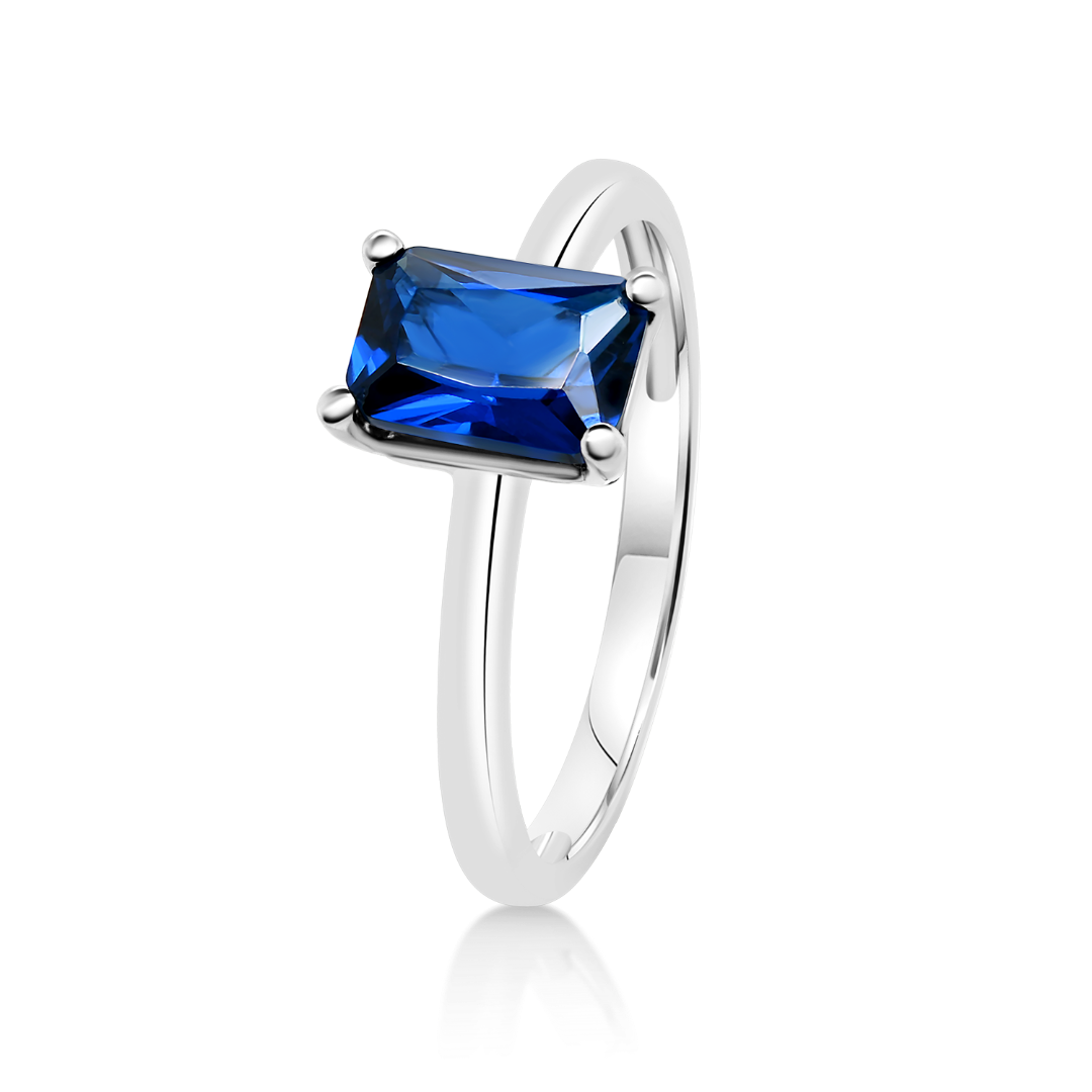 Inel din aur alb de 14K cu piatră cubic zirconia albastră.
