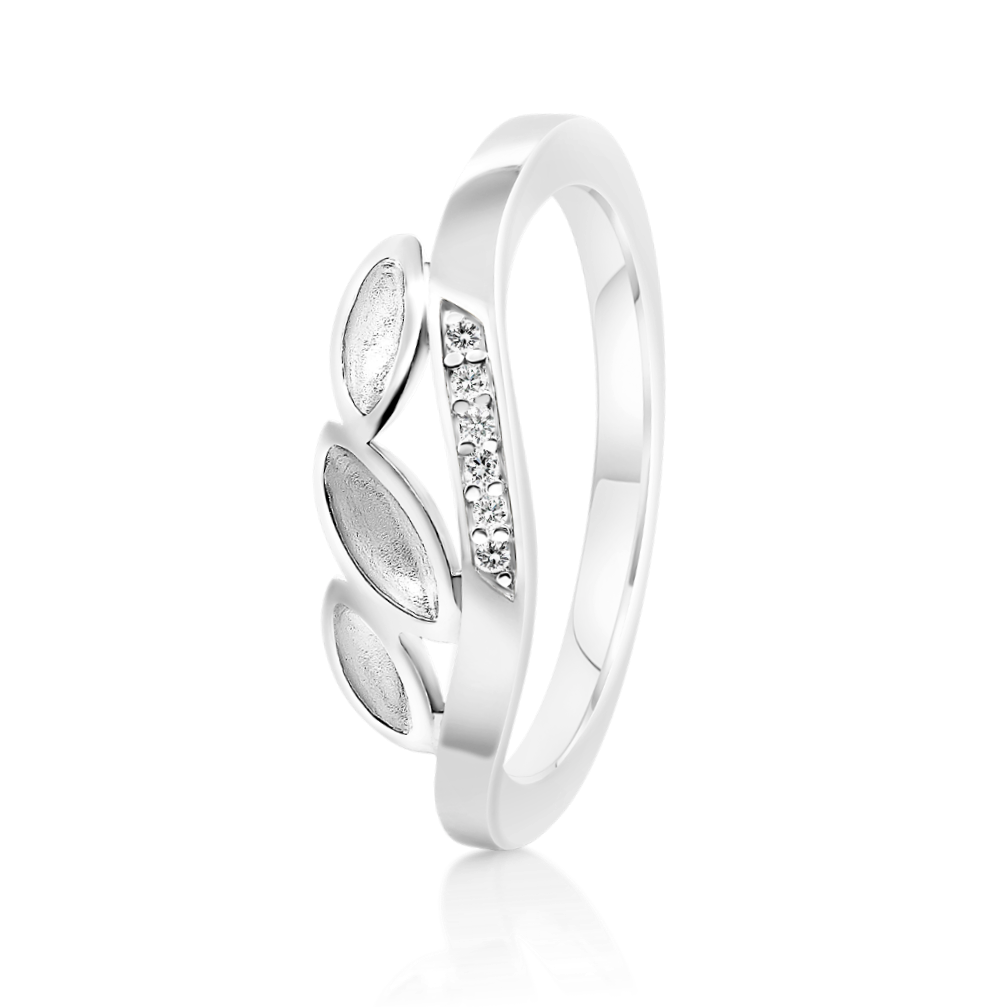 Inel din aur alb de 14K, cu elemente mate și pietre cubic zirconia.