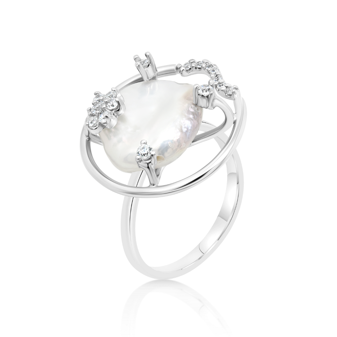Inel din aur alb de 14K cu Sidef şi pietre cubic zirconia.