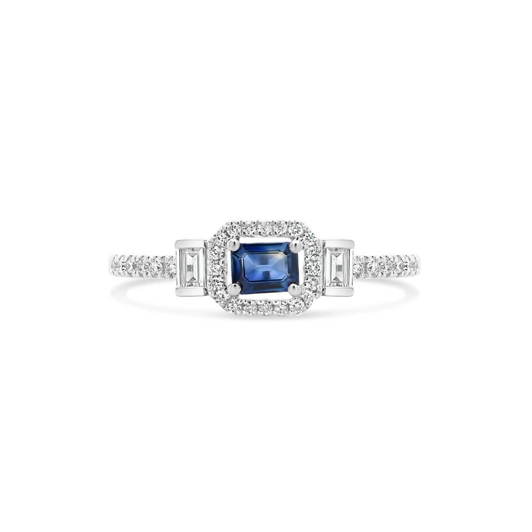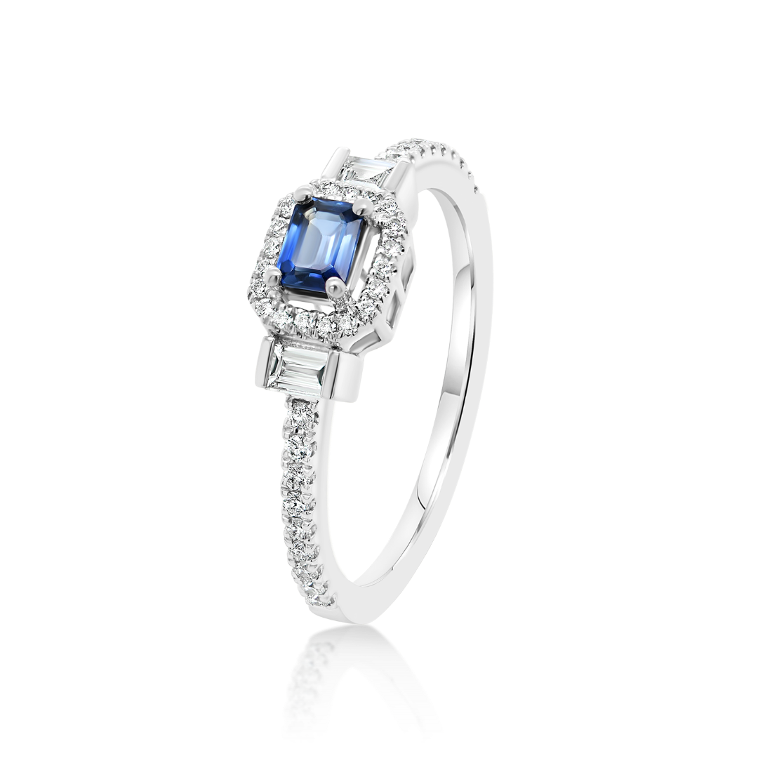 Inel din aur alb de 18K, încrustat cu 40 de Diamante naturale Round Brilliant de 0.24ct și un Safir albastru 0.25ct.