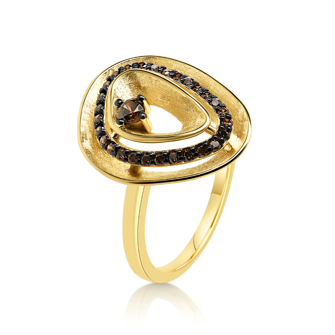 Inel din aur galben de 14K cu elemente satinate și zirconia maro.