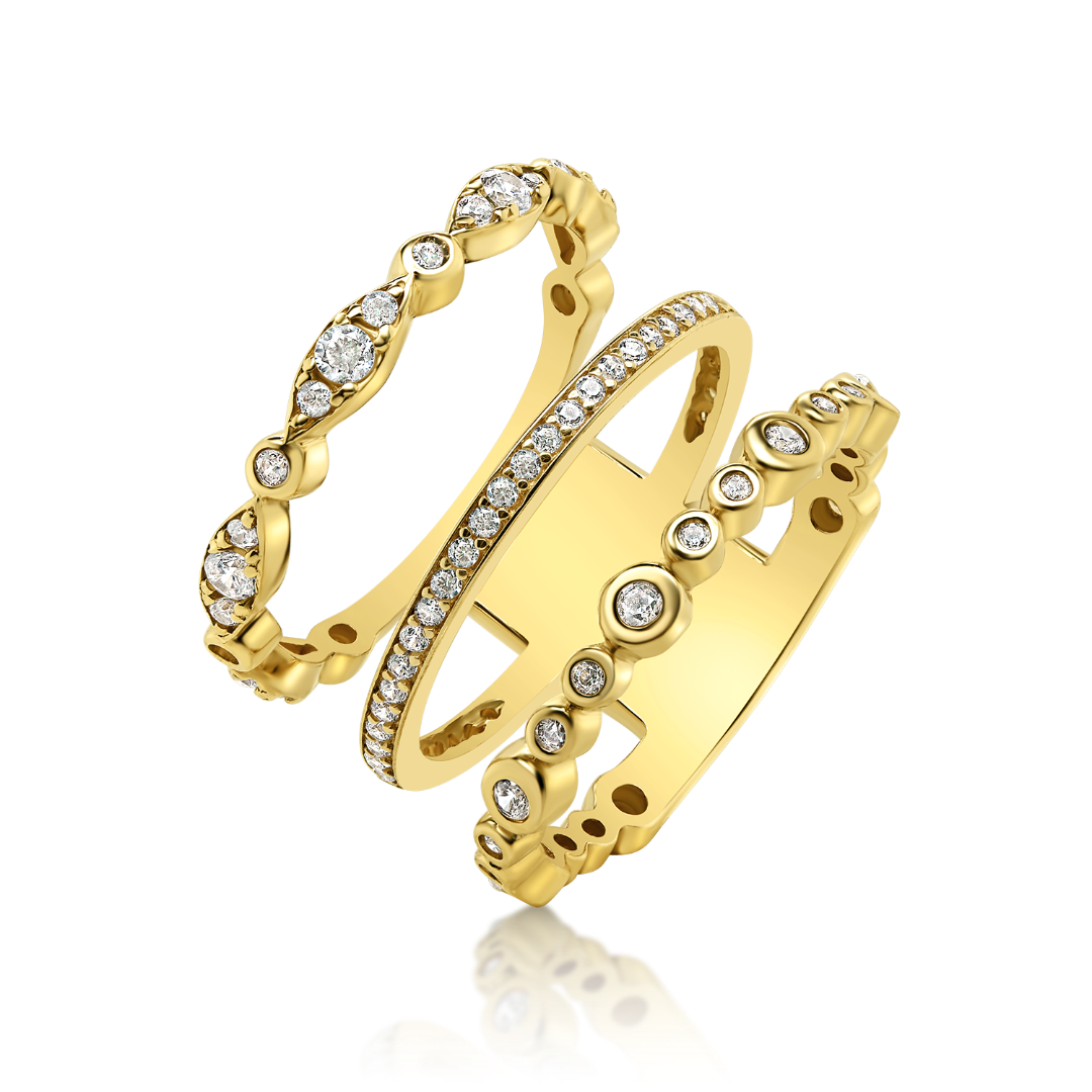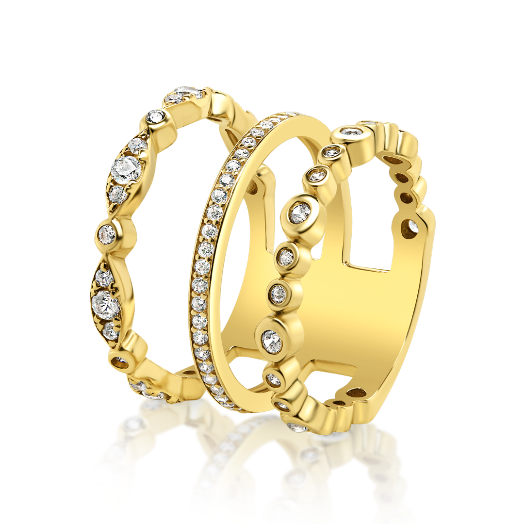 Inel triplu din aur galben de 14K cu pietre cubic zirconia.