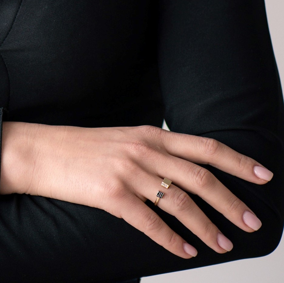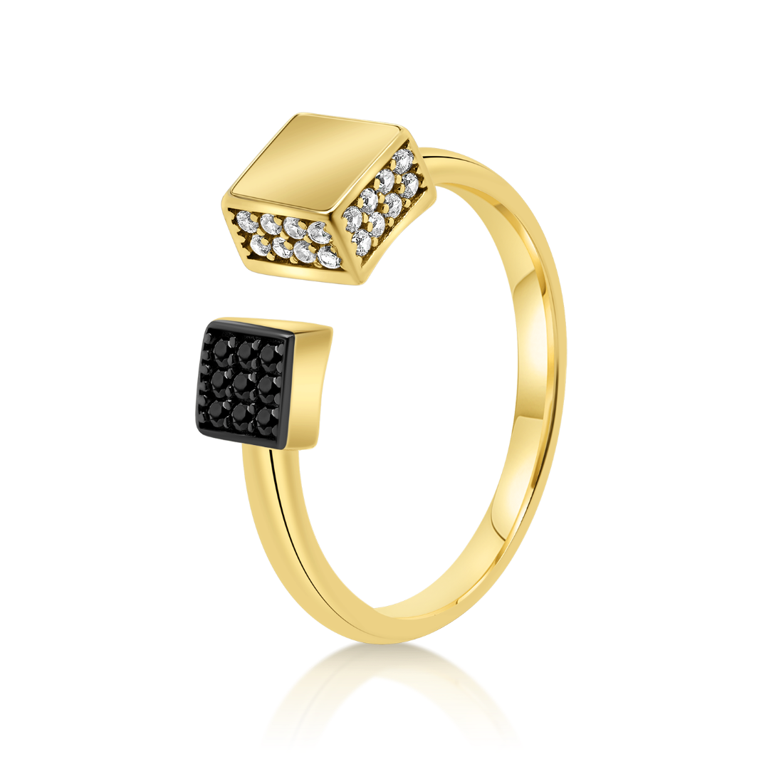 Inel reglabil din aur galben de 14K, cu rodiu negru și pietre Cubic Zirconia albe și negre.