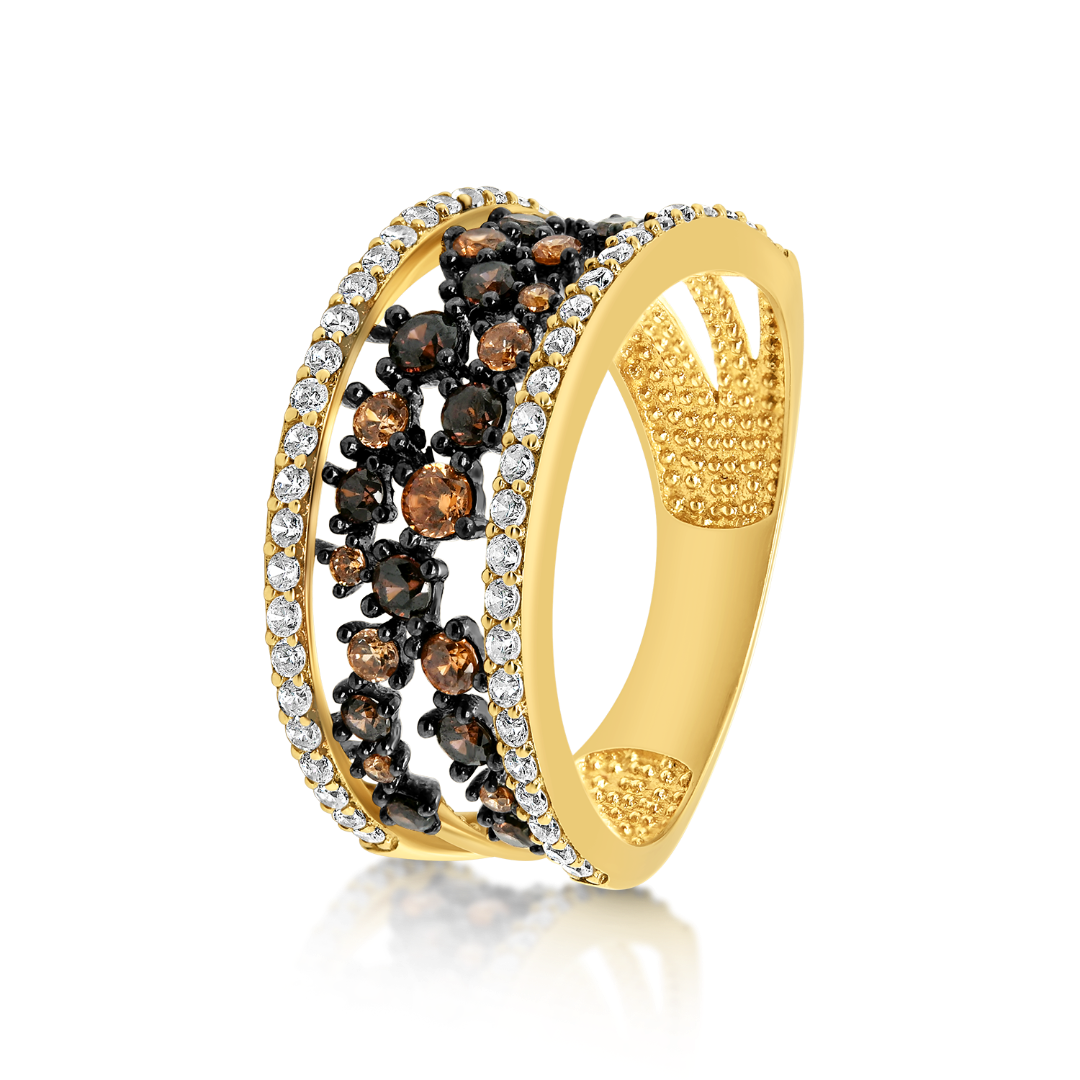 Inel din aur galben de 14K, cu pietre Cubic Zirconia albe și maro.