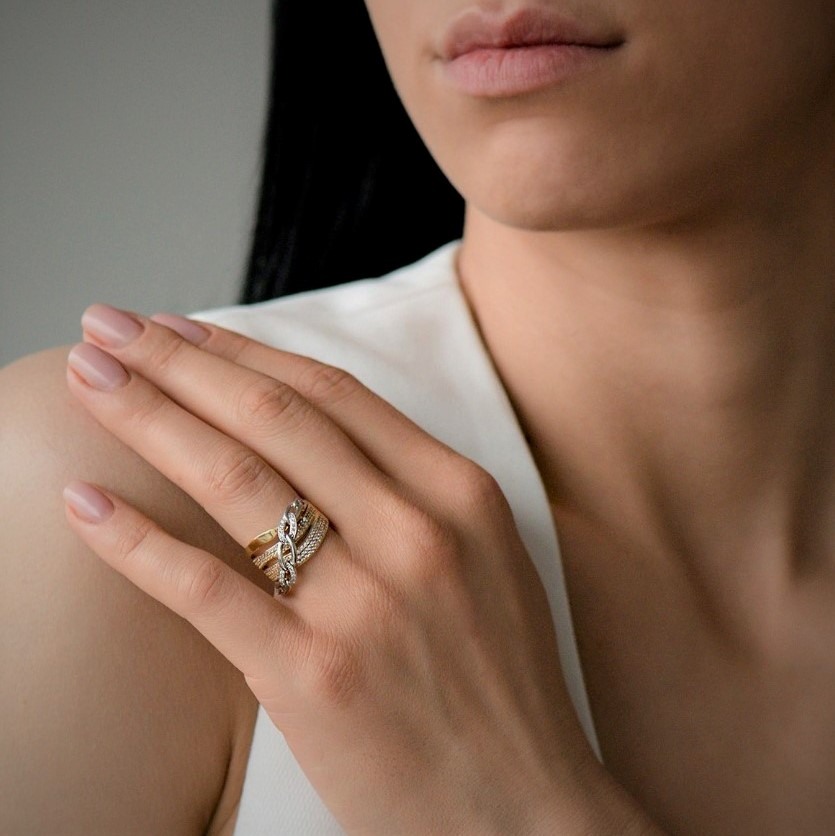 Inel din aur galben de 14K, cu elemente împletite din aur alb încrustate cu pietre Cubic Zirconia.