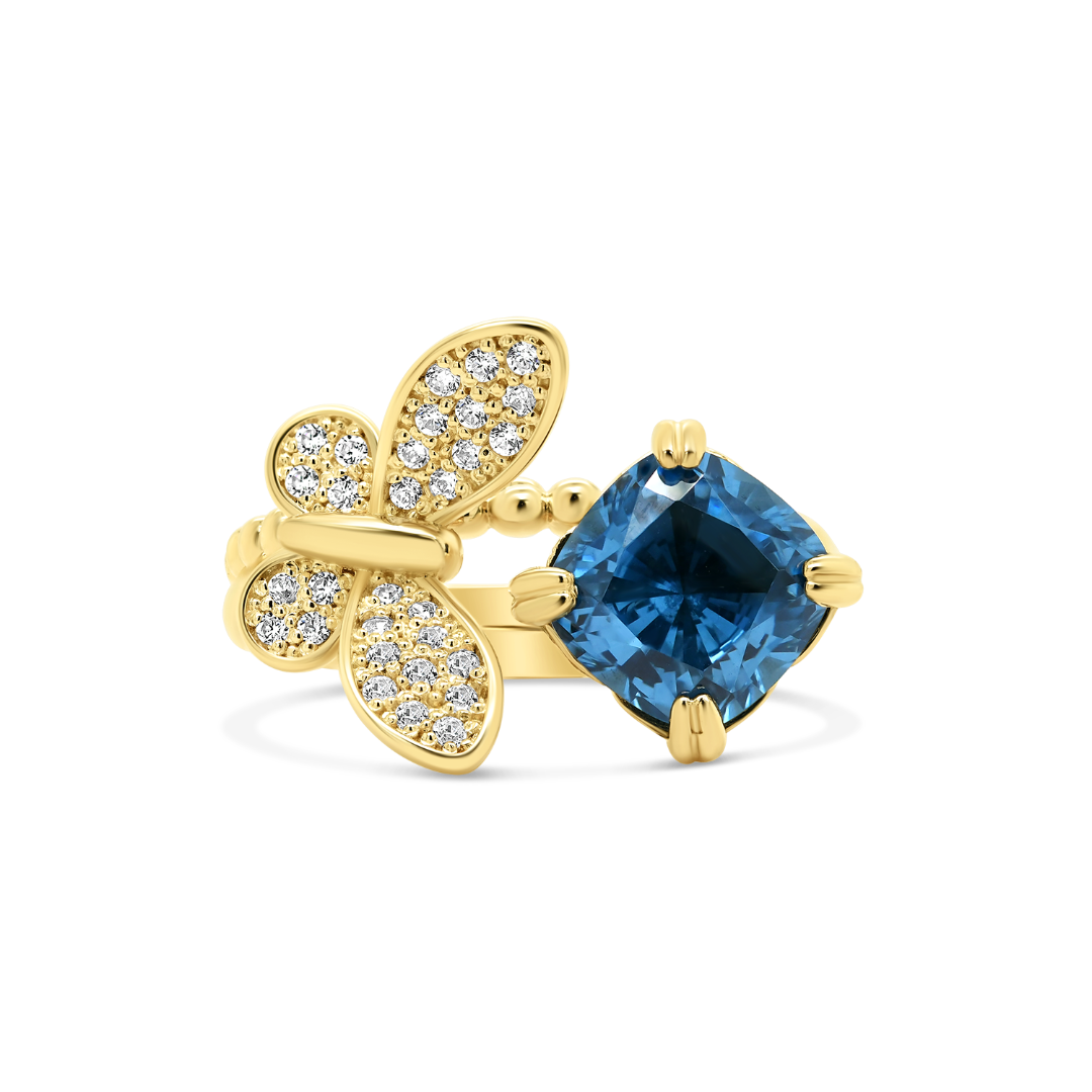 Inel din aur galben de 14K cu pietre cubic zirconia și element fluture.
