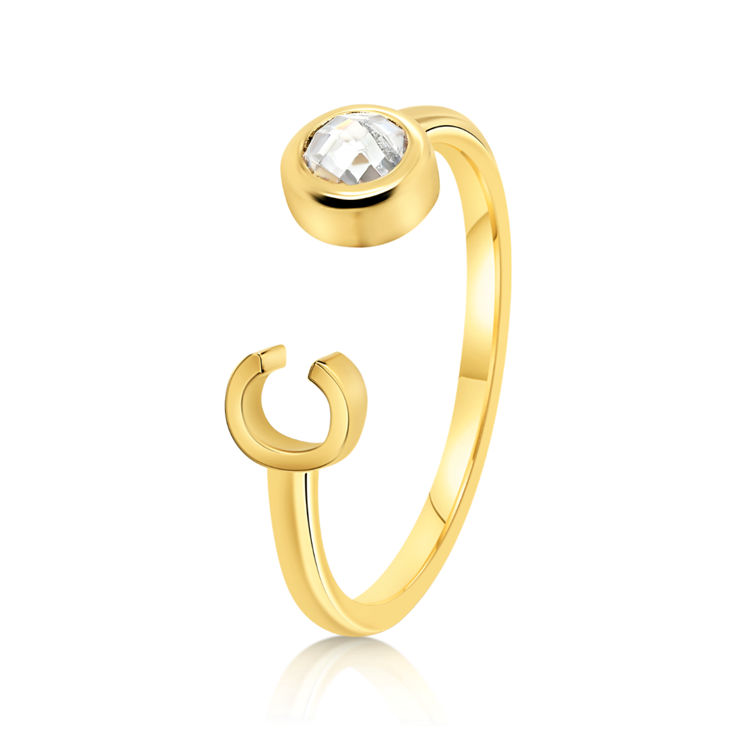 Inel din aur galben de 14K, cu element în forma literei C și piatră cubic zirconia.