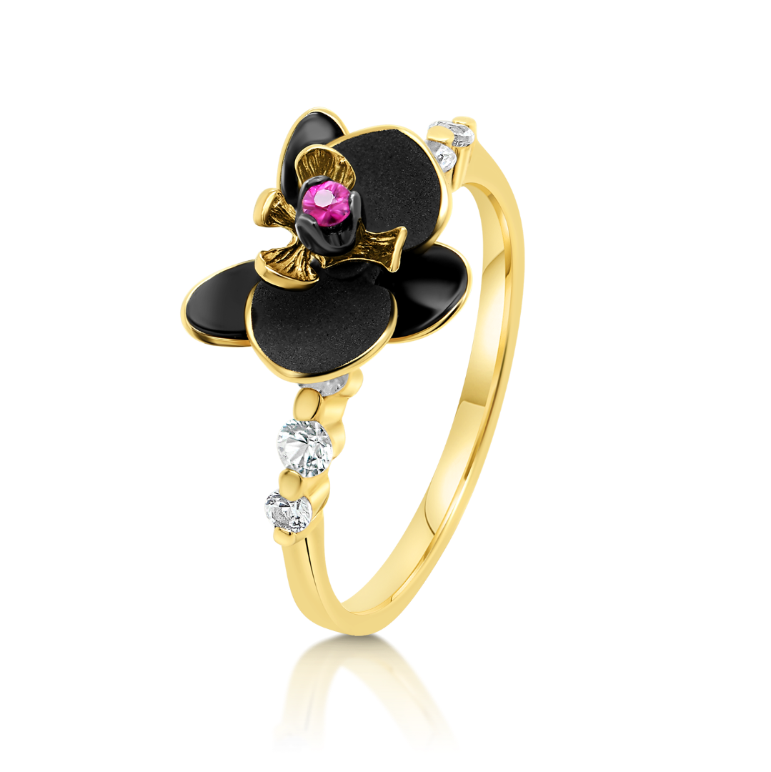 Inel cu Email negru din aur galben de 14K, încrustat cu 6 Safire albe de 0.21ct. și un Safir roz de 0.03ct.