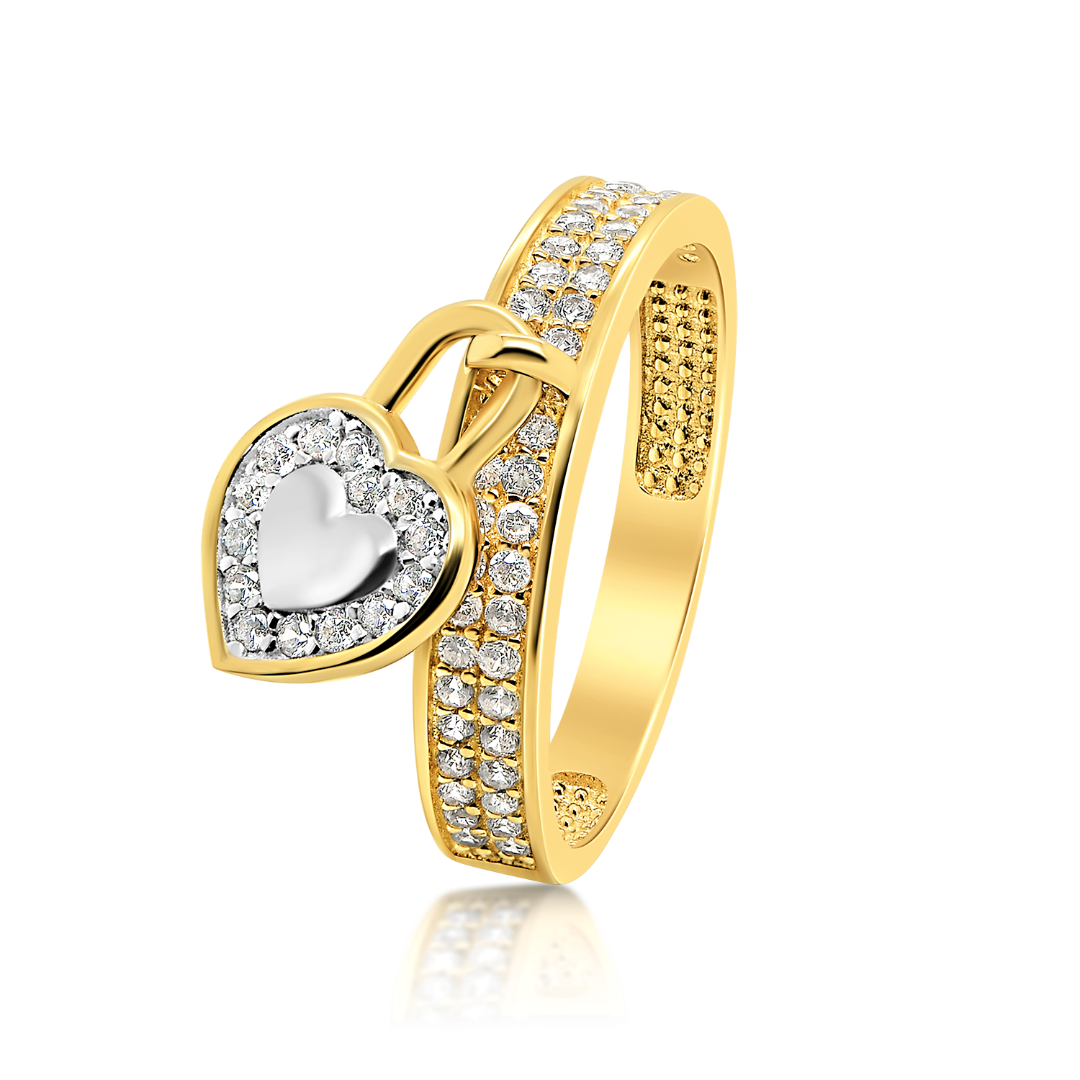 Inel din aur galben de 14K, cu element în formă de lacăt și pietre Cubic Zirconia.
