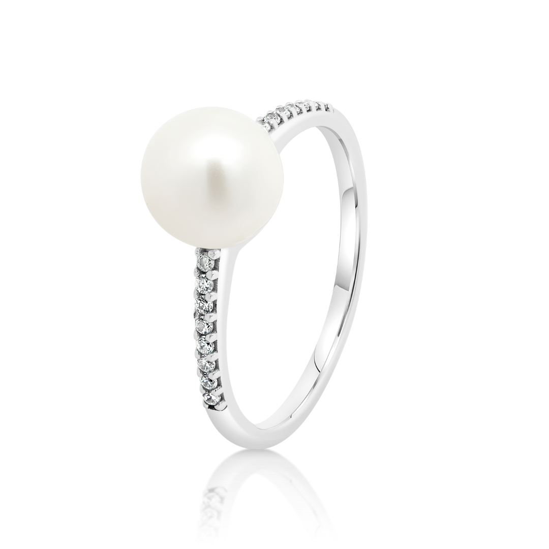 Inel din aur alb de 14K, cu Perlă de cultură albă și pietre cubic zirconia incolore.