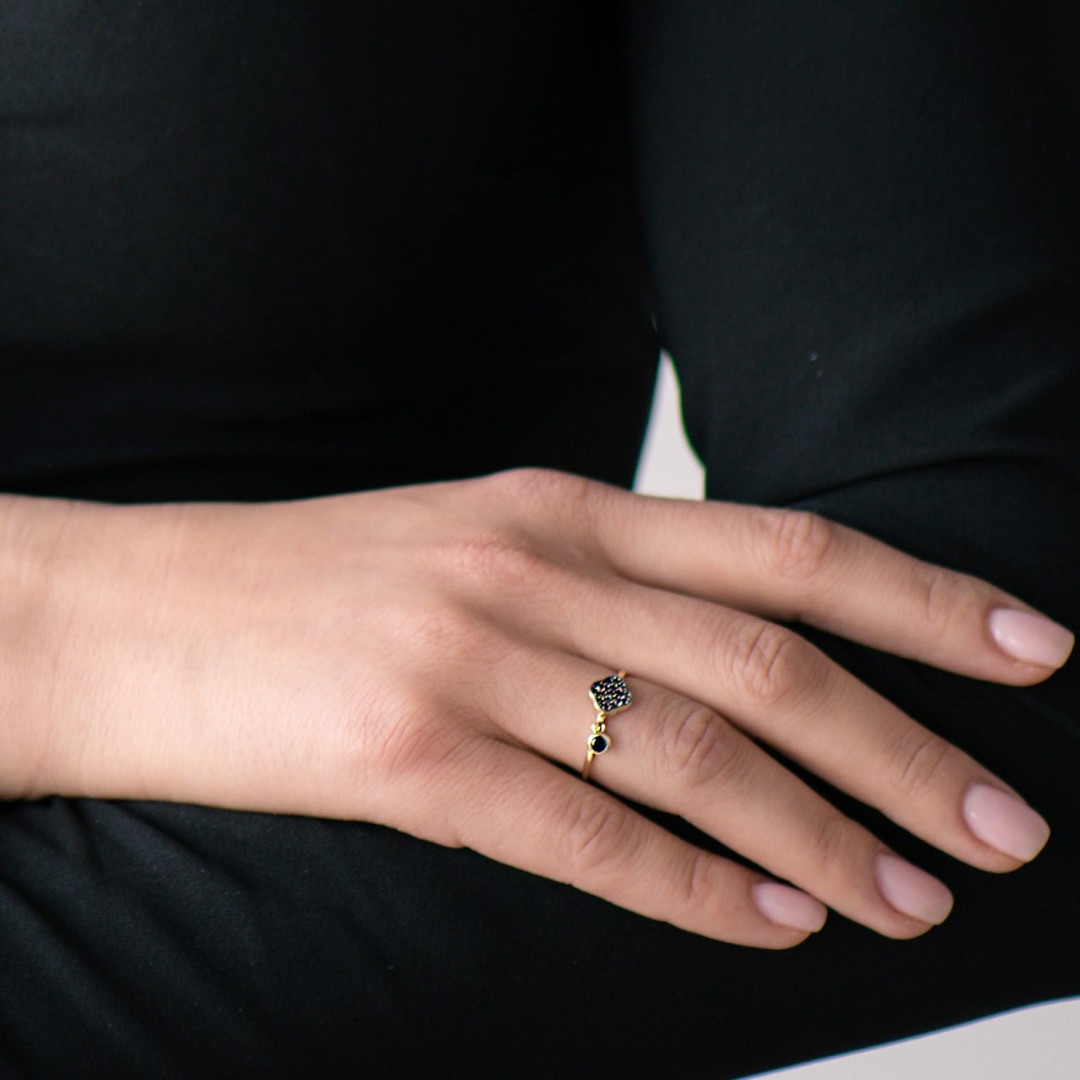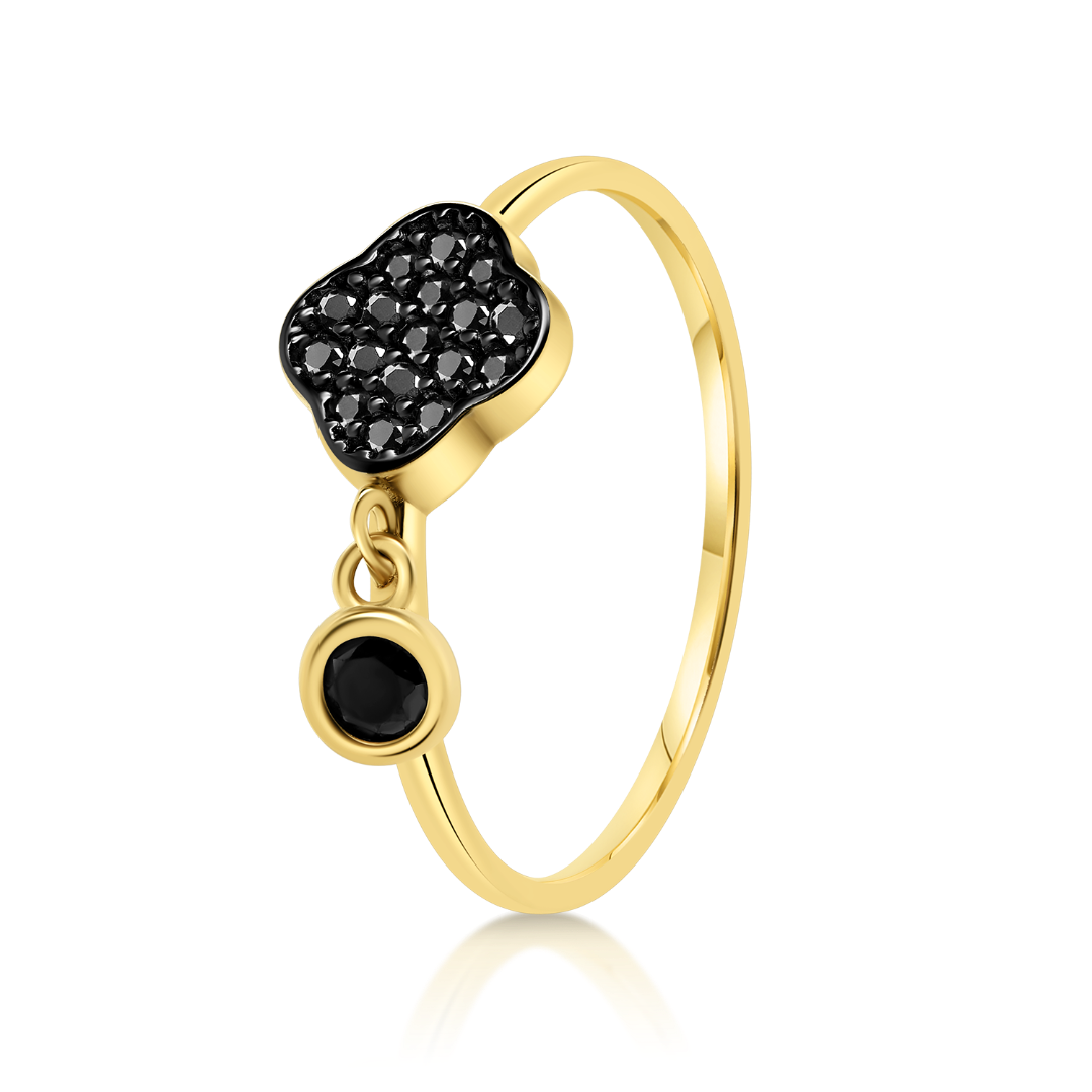 Inel din aur galben de 14K, cu pietre Cubic Zirconia negre și element rotund.
