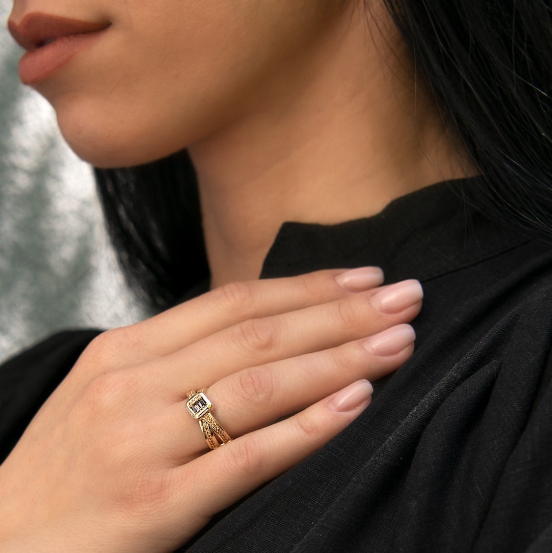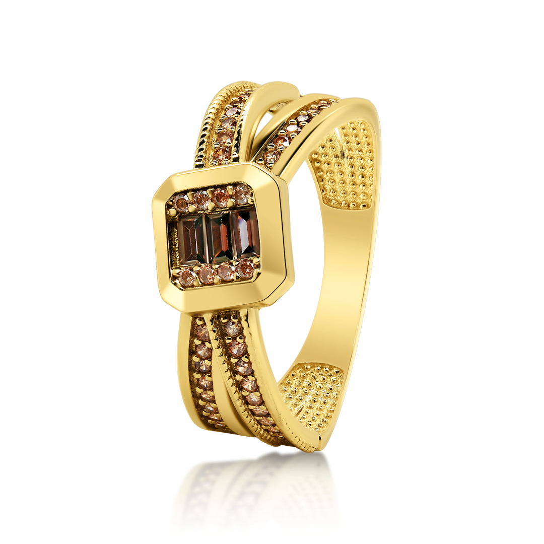 Inel cu șină dublă din aur galben de 14K și pietre cubic zirconia maro.
