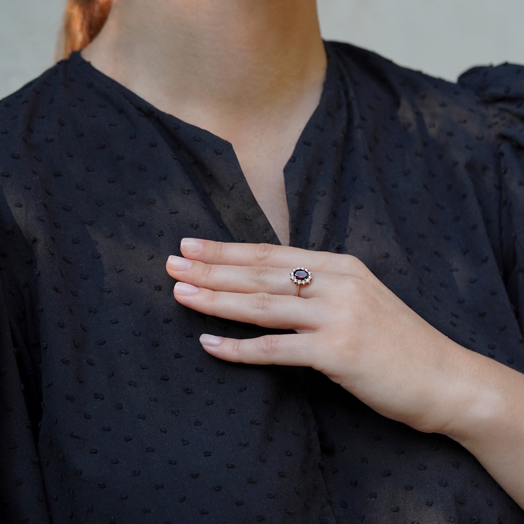 Inel din aur roz de 14K cu Granat și pietre cubic zirconia.