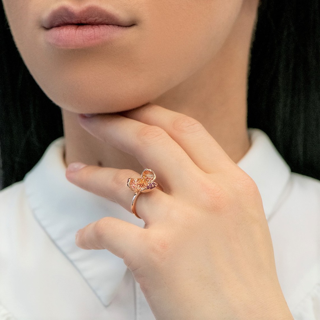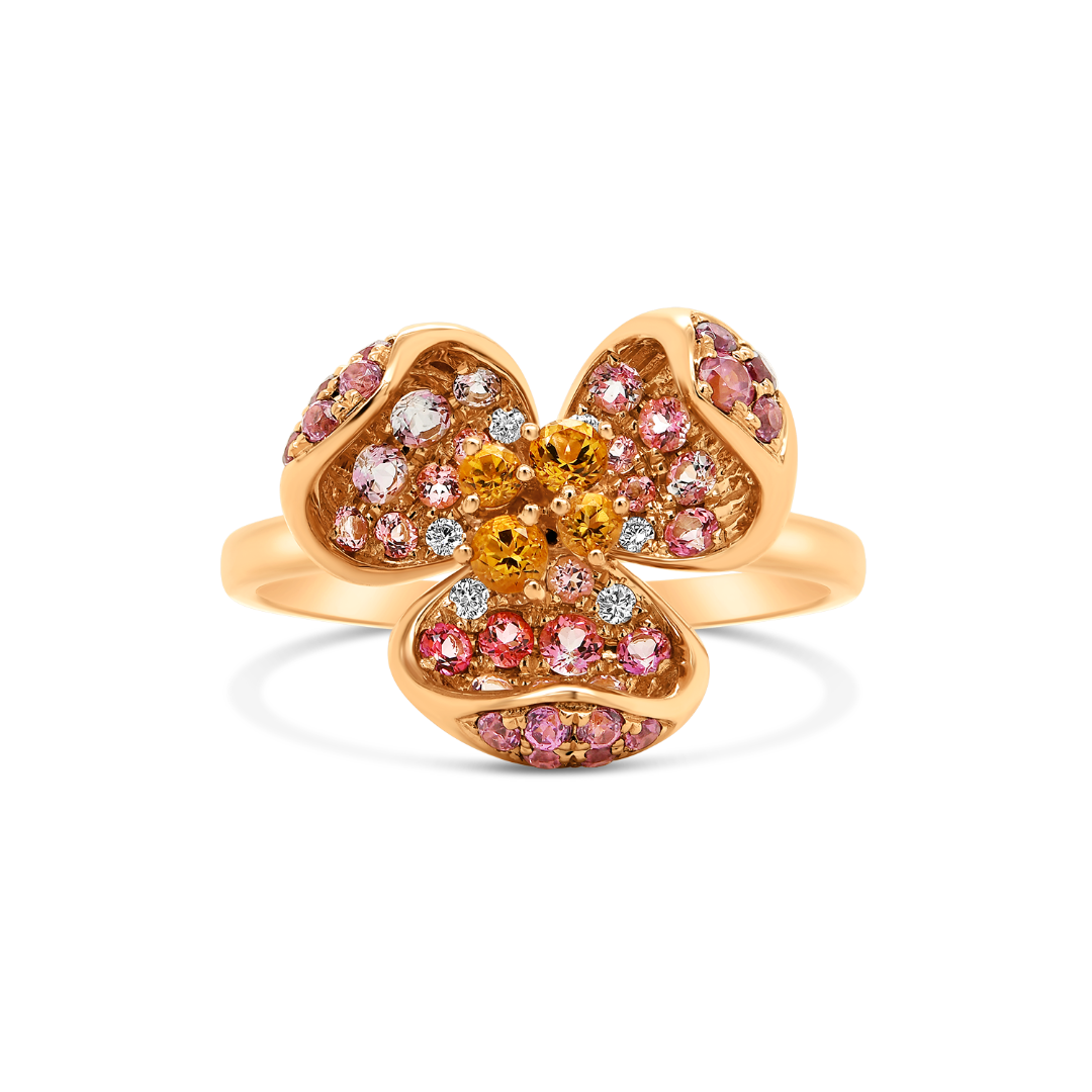 Inel din aur roz de 18K încrustat cu 6 Diamante naturale de 0.046ct, 26 de Topaze roz de 0.51ct, 15 pietre Granat de 0.39ct și 4 Citrine de 0.19ct.