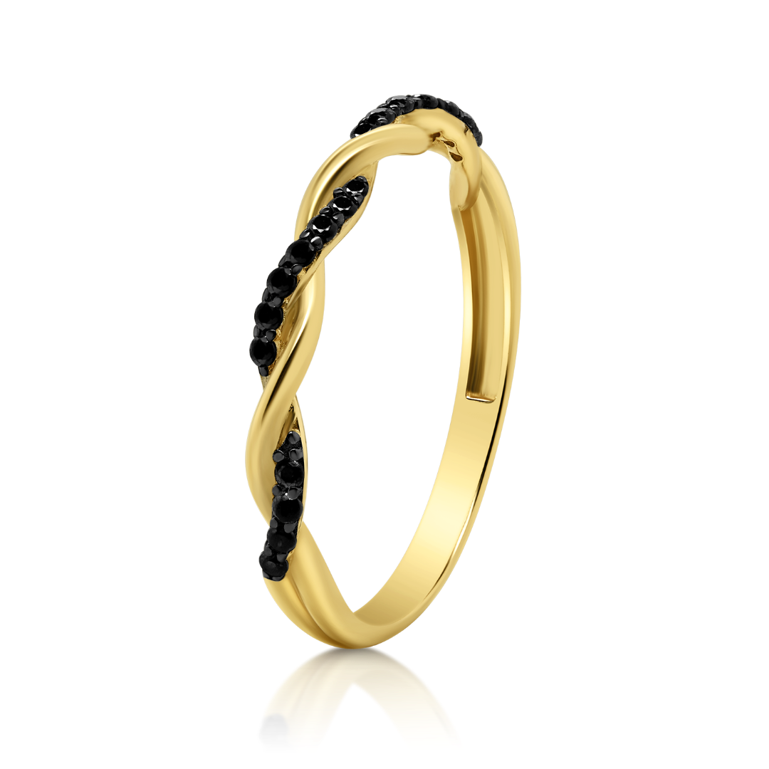Inel din aur galben de 14K, cu design împletit și pietre Cubic Zirconia negre.