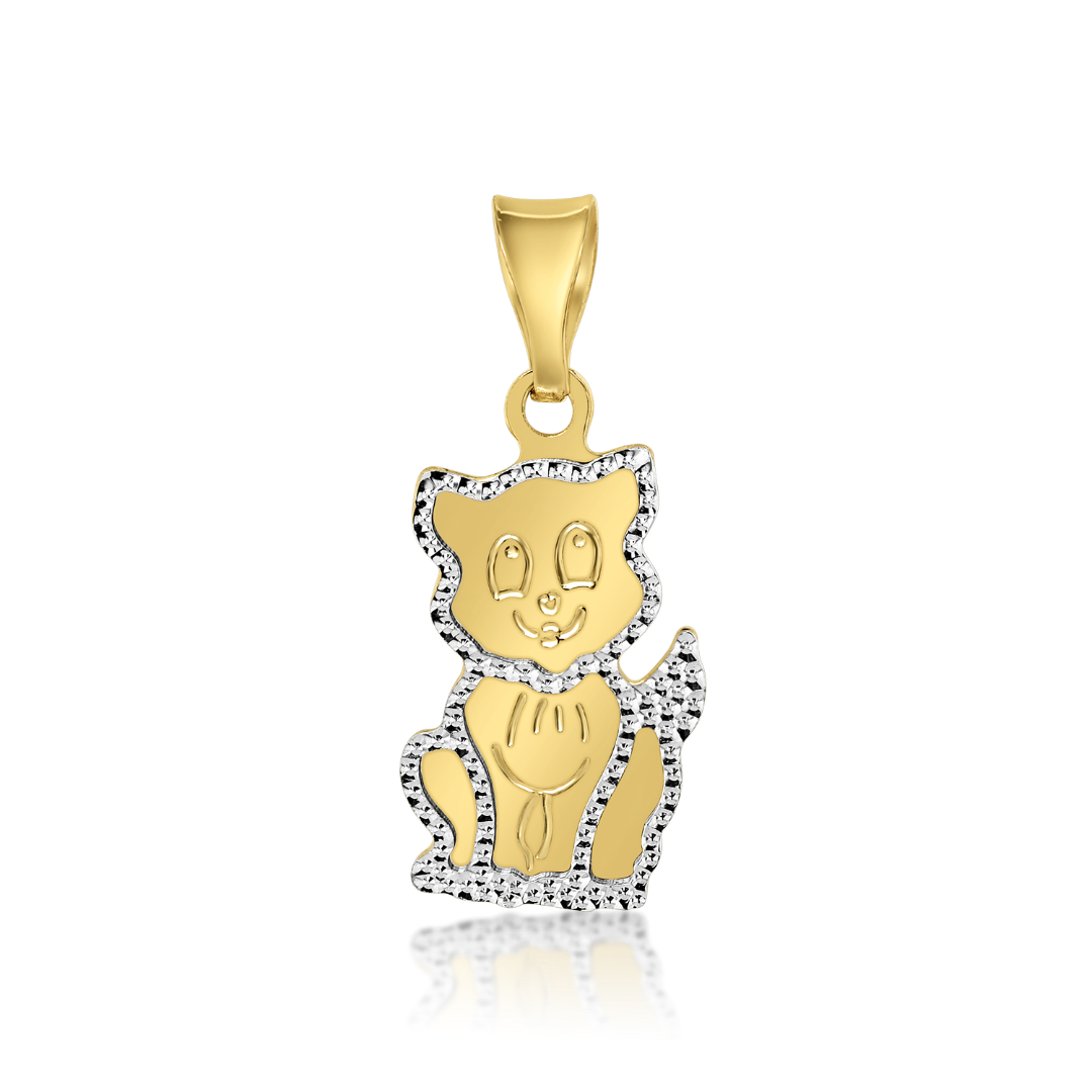Pandantiv tip pisicuță din aur galben de 14K cu aur alb fațetat.