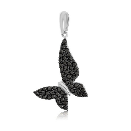 Pandantiv din aur alb de 14K, tip fluture, cu pietre Cubic Zirconia negre.