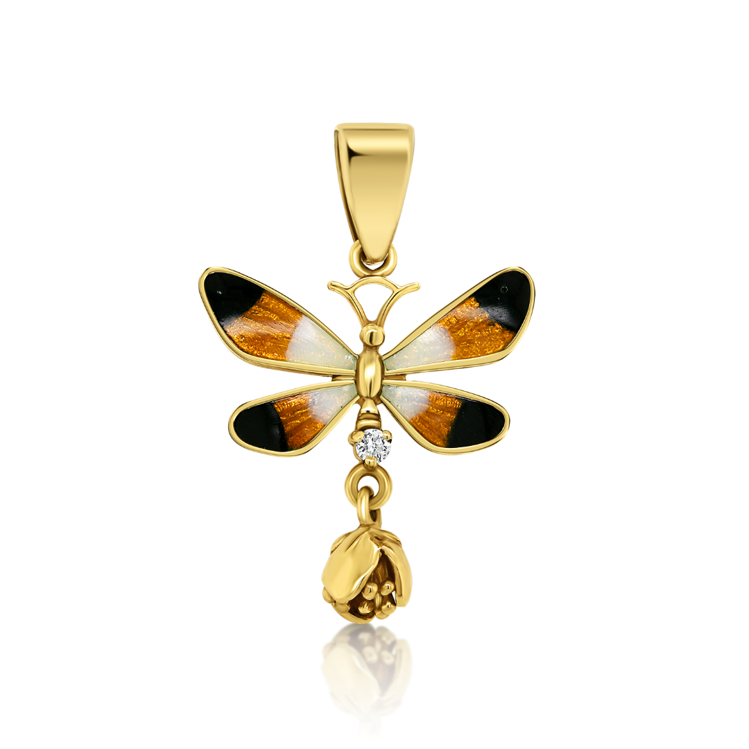 Pandantiv tip fluturaș din aur galben 14K, cu email și pietre Cubic Zirconia.